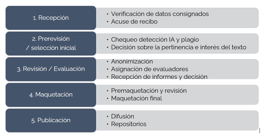 A continuación, se describe el proceso editorial completo con la finalidad de adelantar a los autores los pormenores de las distintas fases del ciclo de publicación.